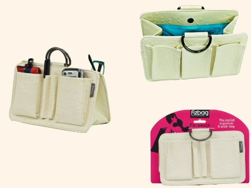 Cream handbag organiser in cream ostrich skin effect outer with water resistant coating and vibrant Turquoise lining and metal handles with magnetic press-stud catch.